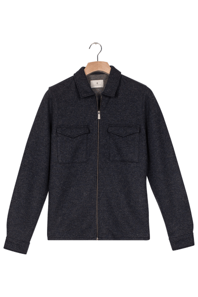 Overshirt in een wol-look met rits in een uni midden blauwe kleur. Casual vervanging voor het colbert, wordt vooral open gedragen met een shirt eronder.
