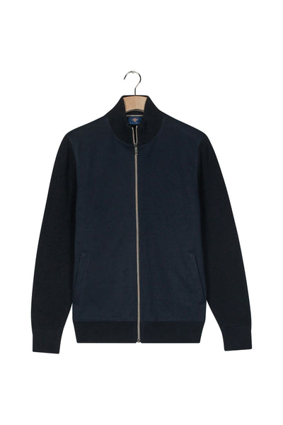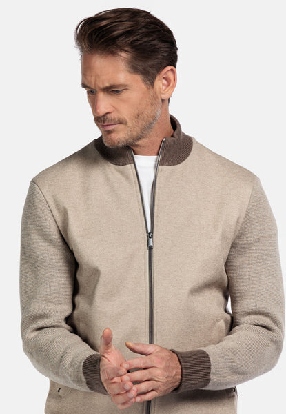 Uni vest met gebreide mouwen, boord en achterpand. Aan de gehele voorzijde een applicatie van zachte twill. Ritssluiting en 2 zijzakken met ritssluiting