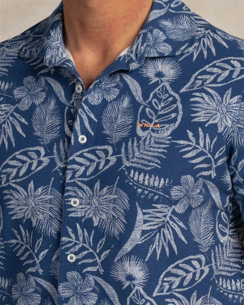 Navy Sky (blauw shirt met licht gekleurde botanische print)