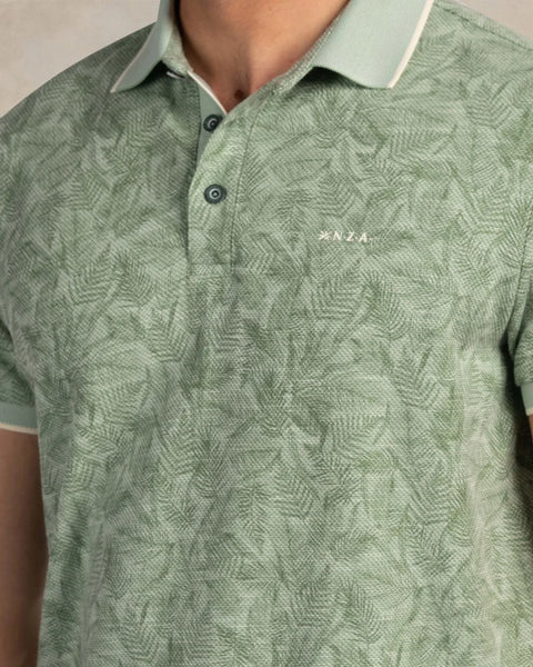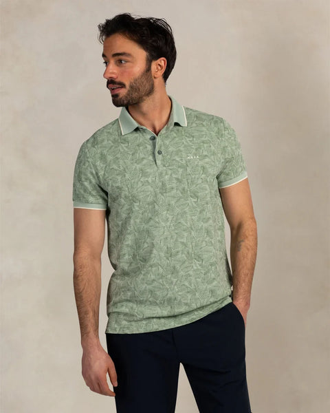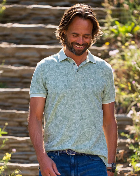 Polo korte mouw in een botanische print van varens. De kraag en mouwen van de polo hebben een contrasterend randje. De knoopsluiting heeft de 3 knopen in ton sur ton kleur. Kortom deze polo biedt een comfortabele en ademende ervaring in een regular fit die perfect aansluit.