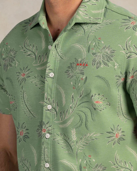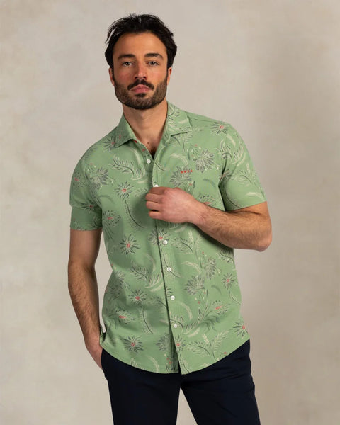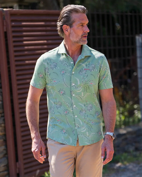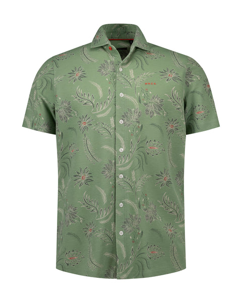 Shirt korte mouw in een botanische print. Dit shirt heeft een klassieke kraag met een rode knoopsluiting en korte mouwen, wat zorgt voor een tijdloze en veelzijdige look. Dit hemd biedt een comfortabele en ademende ervaring in een regular fit die perfect aansluit.