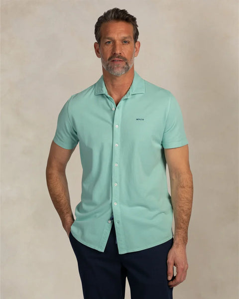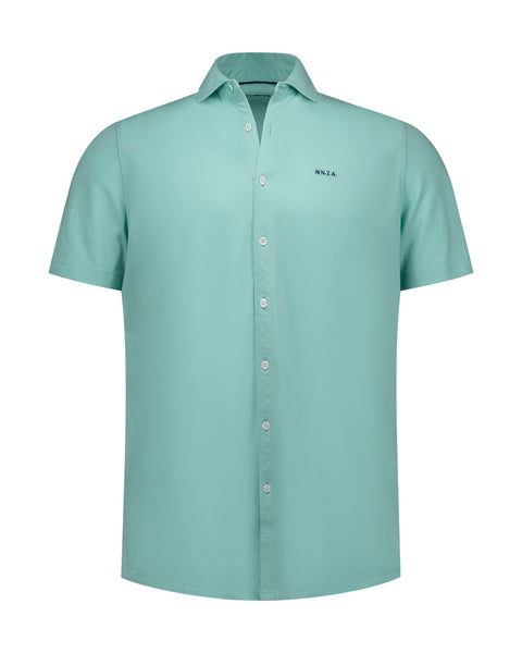 Dit mint groene NZA New Zealand Auckland overhemd voor mannen is uitgerust met een klassieke kraag en knoopsluiting, perfect voor een casual maar stijlvolle look. Het shirt met korte mouwen heeft een subtiel logo op de borst en is gemaakt van 100% katoen, wat zorgt voor een ademend en comfortabel draaggevoel. De regular fit biedt een tijdloze pasvorm die veelzijdig te combineren is, bijvoorbeeld met een bermuda voor een relaxte uitstraling of met een nette chino voor een meer verfijnde look.
