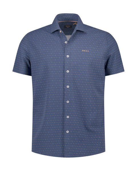 Shirt korte mouw in een oranje bloemetjes microprint. Dit shirt heeft een klassieke kraag met een fluor oranje knoopsluiting en korte mouwen, wat zorgt voor een tijdloze en veelzijdige look. Dit hemd biedt een comfortabele en ademende ervaring in een regular fit die perfect aansluit.